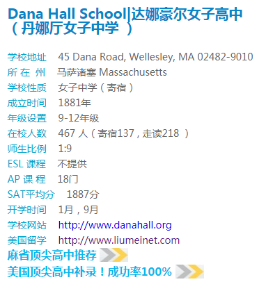 达娜豪尔女子高中Dana Hall School成立于1881年,位于美国马萨诸塞州韦尔斯利地区,距离波士顿市中心17英里,这里交通便利,每年均会有烟花汇演,此汇演是美国当地市政府最精心制作和最壮观的表演之一。达娜豪尔女子高中占地面积50英亩,是一所私立寄宿制的大学预备学校,也是波士顿地区唯一的寄宿制女子高中,该校致力于帮助学生们在大学准备过程中取得学术、艺术及体育等方面的优异成绩。达娜豪尔女子高中的学生体现了多元化的人才及兴趣,该校提供了相当多样的体育活动项目。