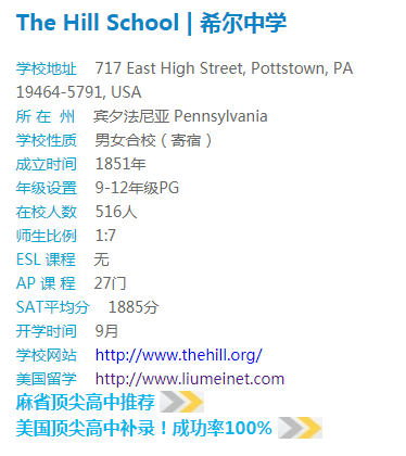 希尔中学The Hill School建立于1851年,是一所高教育质量的男女混合学校。学校教学严谨,课程强调批判性思考及写作为学生提供了杰出的艺术教育课程,为学生将来考取美国著名大学以及将来事业的成功打下良好的基础。学校课程强调批评性思维及写作。学校对学生的期望是:有领导能力,有责任心以及谦恭有礼。