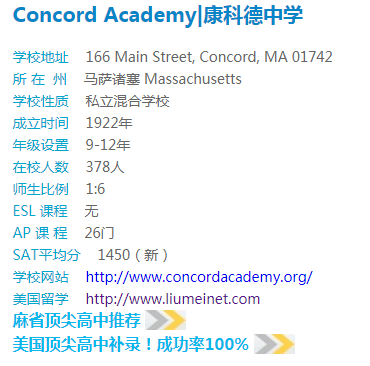 康科德中学位于马萨诸塞州,成立于1922年。学校占地39英亩,优美校园,设备完善,离波士顿18英里,距剑桥市约30分钟,与同列美国私立寄宿高中“第一梯队”的其他学校相比,康科德学院最大的特色就是艺术氛围浓厚。约翰·肯尼迪的女儿-卡洛琳·肯尼迪就读于此,学校是一所顶尖寄宿中学,感兴趣的朋友可以马上咨询。