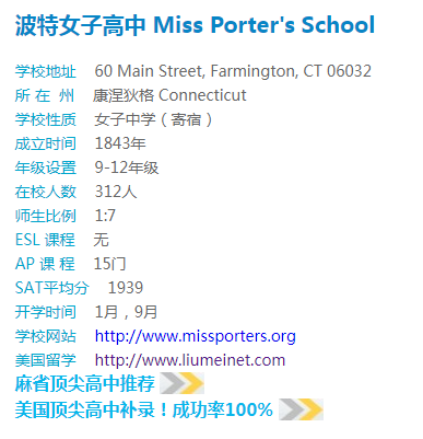 波特女子中学位于美国康涅狄格州的法明顿市,美国60多个图书馆于1948-1972年实施的一项有关合作收集外国出版物的自愿协定,该城市因1942年10月在康州法明顿召开的讨论会促成此计划而得名。波特女子中学成立于1843年,是一所大学预备的女子中学。该学校为学生提供了丰富多彩的学术课程和各种各样的体育活动,拥有18个校际体育队。另外,在波特女子中学,课堂是一切的核心,该校有着严谨的治学氛围,同时也十分注重同学间以及师生间良好关系的建立。作为一所女子学校,该校比较注重学生在艺术方面的培养。