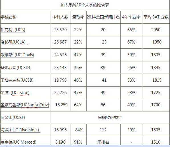 留学美国的中国学生选择学校时,加大系统的学校是非常受欢迎的。加州大学系统(University of California)是美国最好的公立大学之一。不但在华人最多的加州,地理位置优越,而且教育质量优良。其中加大伯克利(UCB)和洛杉矶(UCLA)更是中国学生留学美国普遍关注的美国新闻排名最高的两所公立大学。 然而加大系统的各个学校之间有很大的不同。下面的图表给出了前几年加大10个大学的一些数据,便于留学美国的学生及家长进行比较。