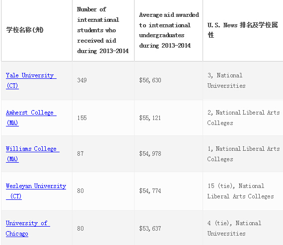 下面这些学校在2013-2014年间给国际生提供平均奖助金是$50,000。其中以耶鲁为首,平均数高达$56,630。