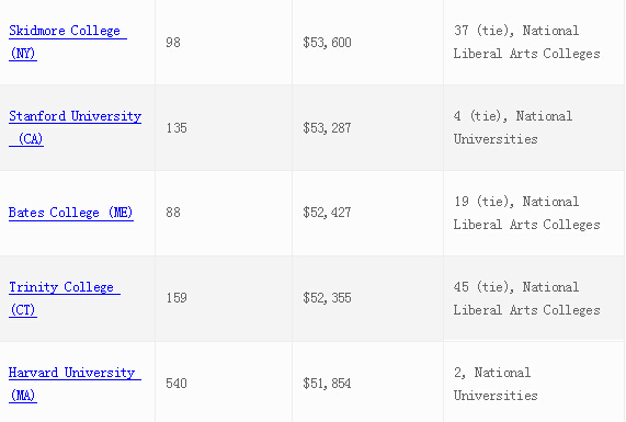 好消息是下面10所最为慷慨的学校,一半以上是综合大学或文理学院的领头羊。坏消息是这些学校竞争极其激烈。比如耶鲁大学,在 2013-2014学年给国际生(本科)的人均奖学金高达$56,630 ,它的录取率只有6.9 %。阿默斯特学院办法给国际生的人均奖学金是$55,121,而录取率也只有14.3%。