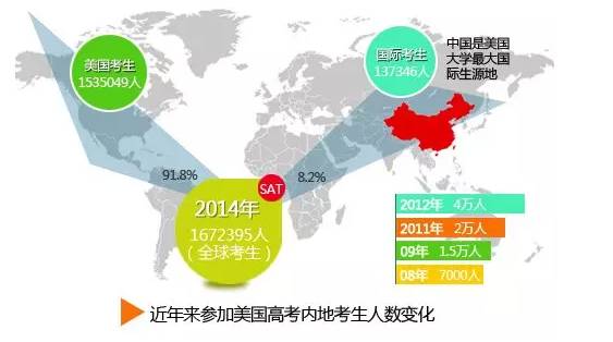 2015年,中国大陆高考人数是942万,而2008年,这个数字是1050万。与中国大陆高考人数下跌相比,SAT考试倒是越来越热,甚至出现井喷状态。SAT官方机构美国大学委员会披露的数据显示,来自大陆的考生2008年7000人、2009年1.5万人、2011年2万人、2012年激增至4万人。2014年全球参加SAT的国际考生人数达到13.73万人,这其中有一大部分为中国、韩国学生。
