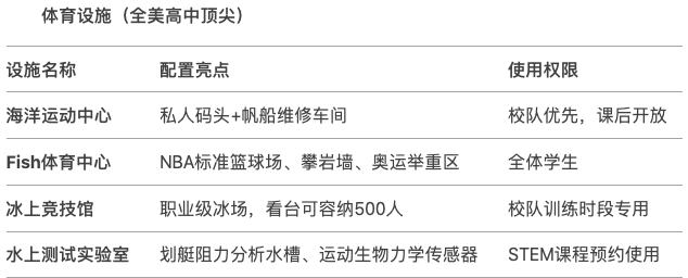 校园设施先进,包括现代化的教学楼、科学实验室、艺术中心、体育馆和运动场、帆船训练基地等。