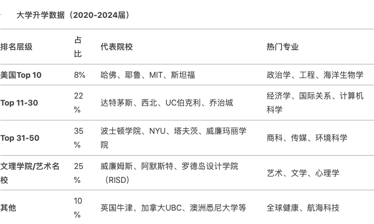 大学录取率:100%(近年毕业生均进入四年制大学,部分学生选择Gap Year或艺术院校)。