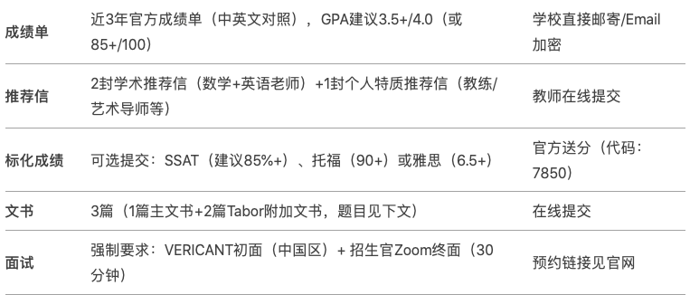 需要提交申请表、成绩单、推荐信、个人陈述和标准化测试成绩,国际学生需提供语言成绩,部分年级还需面试。