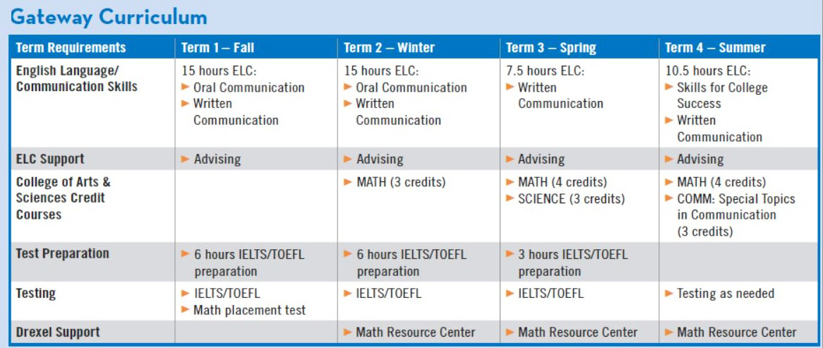 低语言要求,利用9-12月(3-4个学期)让学生充分在语言、学习方法上适应美国课堂,从而在本科学习阶段取得更好成绩,最多可以获得9-12个学分。