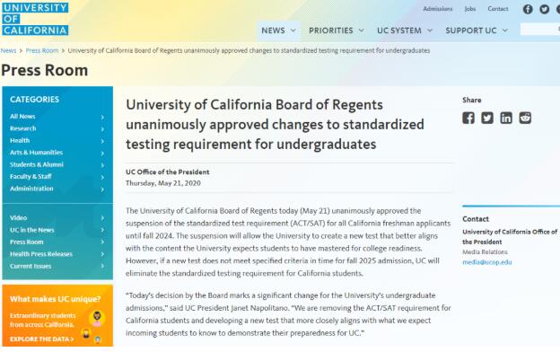 5月21日,UC发布一篇文章,文章显示,加州大学董事会一致批准了UC总校长Janet Napolitano上个月提出的提议——在未来五年内逐步淘汰SAT/ACT,改以开发UC的自主命题考试。