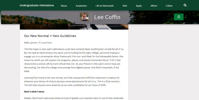 总得来说,Lee Coffin的意思是在如今考试成绩可能无法提交的状态下,班主任和学科老师的推荐信就显得尤为重要,学生在申请达特茅斯时,就需要仔细挑选推荐人了,同时,推荐信的内容也要格外慎重。