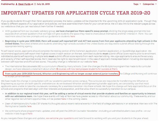 2019年7月25日,宾大更新了2019-2020的申请新政策,在这项声明中,学校表示:从2019-2020开始,沃顿商学院和工程学院将不再接受外部转学。