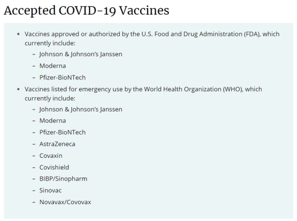 目前美国接受的疫苗有国药疫苗和科兴疫苗。