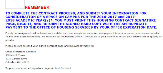 我们要点击“Print Contract”,打印、签字,然后将其跟350美金的 check 或者money order 一起邮寄到OSU的Office of Housing Services。请大家尽早完成。