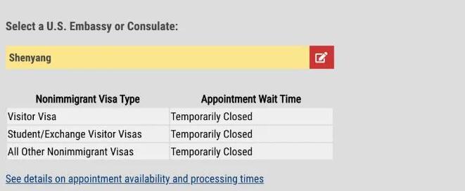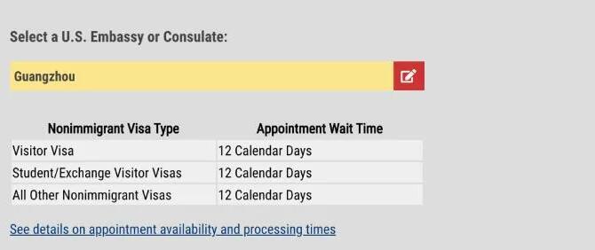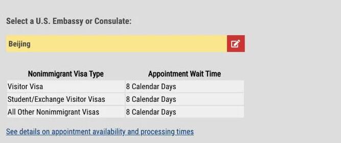 注:在美国大使馆或领事馆接受面谈预约的预估等待时间可能每周都在变动,会根据实际发生的工作量和处理人员数量而定。目前给出的只是预估时间,并不保证一定能得到预约。