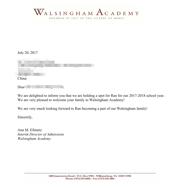 恭喜S同学成功补录到顶尖高中Walsingham Academy