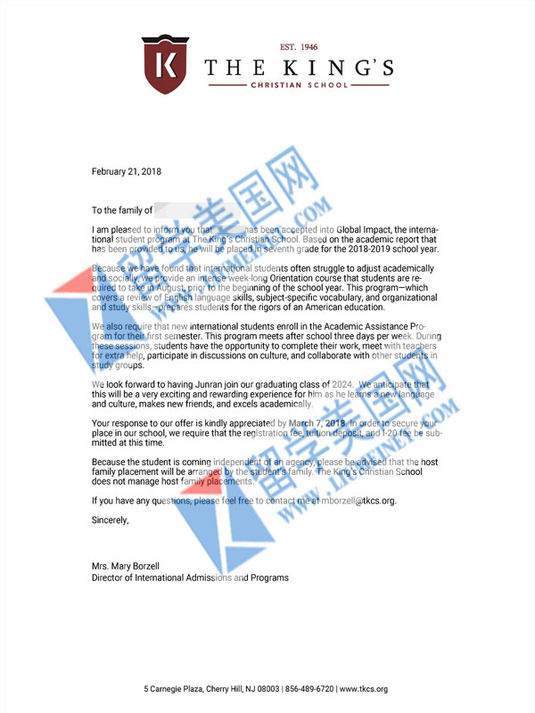 好消息!又一位同学拿到录取offer,Z同学是6申7,学校的名额非常紧缺,留美网通过带Z同学亲自去访校面试,最终拿到了The king’s christian School的录取offer!在这里再次恭喜ZJR同学!美高申请热线:400-000-7805,010-65183908,微信:liumeinet2014
