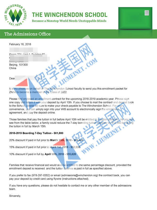 恭喜YZH同学获得The Winchendon School录取offer!这个offer来之不易!难度很大,但是通过留美网全体员工的努力,最终帮Y同学争取到了这个offer!再次恭喜Y同学,预祝Y同学在美国学业有成!展翅高飞!美国留学申请热线:400-000-7805,010-65183908