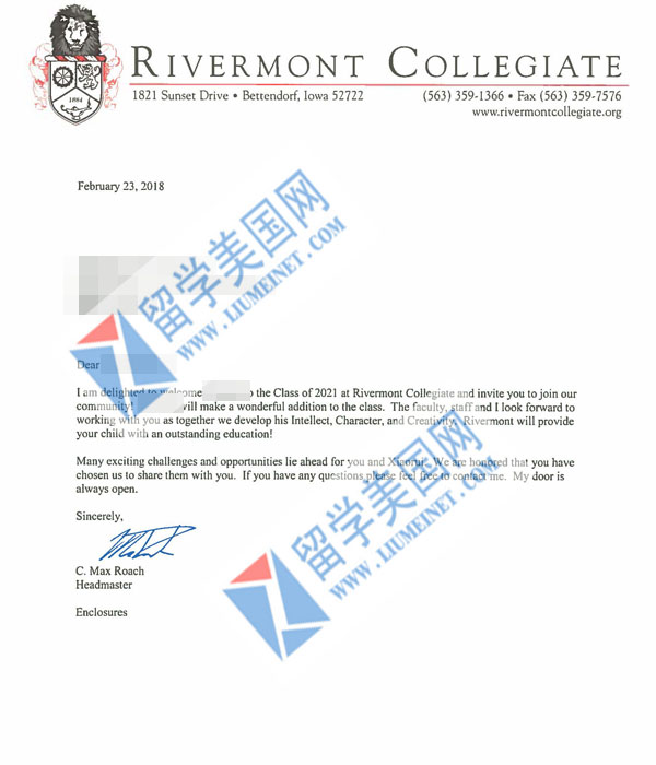 恭喜L同学获得 Rivermont Collegiate 录取offer!【爱荷华州排名第一】!留美网祝L同学在美国前程似锦!学业有成!》》美国高中补录专题