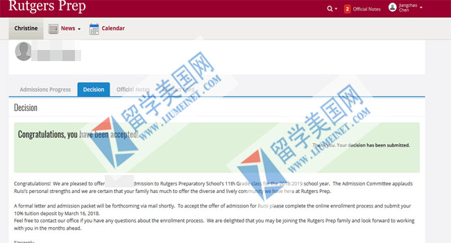恭喜C同学成功获得 Rutgers Preparatory School 罗格斯学校录取offer!感谢留美网全体员工的努力和付出,在这里祝C同学前程似锦,学业有成!美国高中补录热线:400-000-7805,微信:liumeinet2014