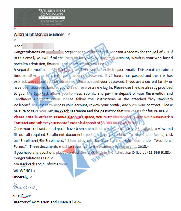 恭喜留美网W同学获得 Wilbraham & Monson Academy 录取offer