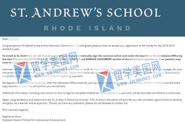 恭喜LXR同学成功补录到罗德岛寄宿学校 St.Andrew's School,目前学校还有1个名额,想申请的同学可以马上咨询:400-000-7805,微信:liumeinet2014