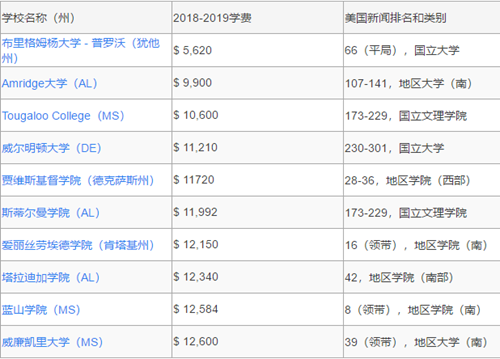 下表显示了2018-2019年收取最多和最少学费的学校。在最便宜的私立学院中,大多数都在南部各州,如密西西比州和阿拉巴马州。