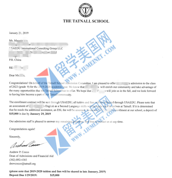 恭喜Z同学获得美国顶尖走读塔特龙学校Tatnall School的offer