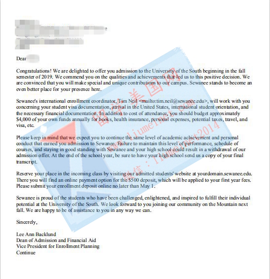 恭喜李同学获得西沃恩南方大学(Sewanee-University of the South)Offer