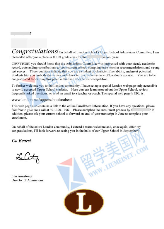 这是一所顶尖的男校,排名很靠前,我们当时的这个学生被雅典纳录取了,托福103,SSAT2100,当时家长对寄宿学校不满意,让我们申请走读,当时我们选择了3所学校,家长对孩子的事情非常重视,于是亲自飞到美国走访了这些学校,最后被录取了,家长最终选择了兰登中学。