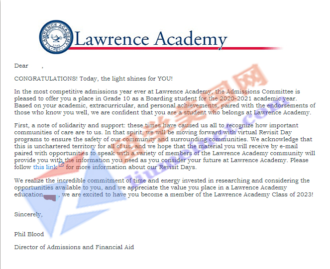 补录捷报!恭喜留美网L同学补录到劳伦斯中学!