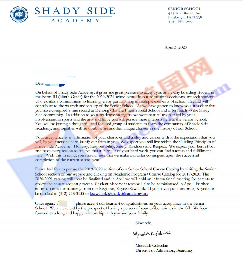 大家好!再传录取捷报!在石老师带领下,经过留美网团队的共同努力,成功帮助L同学拿到了宾州排名第一的顶尖寄宿学校ShadySide Academy(桑迪赛德学院)的录取,再次恭喜L同学!详见录取offer展示!每一个Offer的背后都凝聚了留美网所有同事的共同努力,希望他在美国学业有成!同时感谢家长的配合和信任~