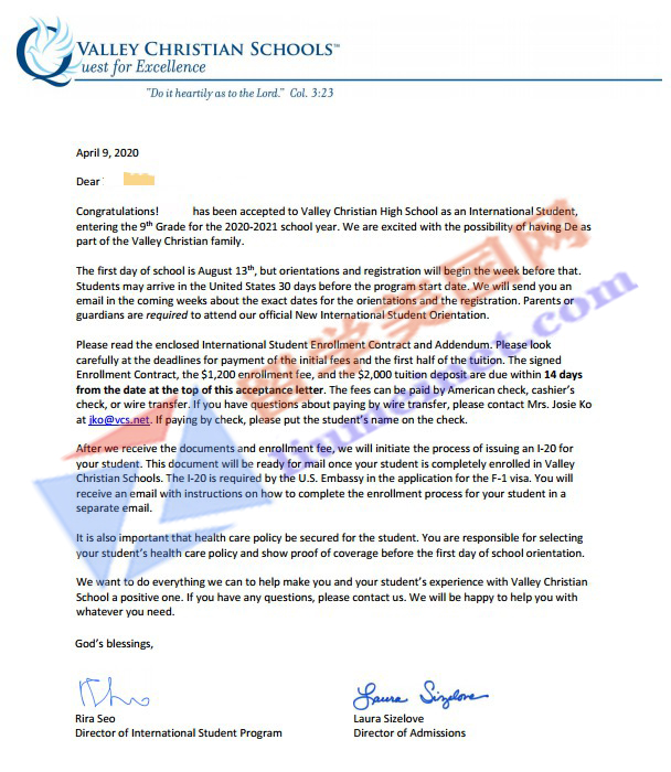 大家好!留美网再创佳绩!在石老师带领下,经过留美网团队的共同努力,在山谷基督圣何塞学校只有一个名额的情况下,成功帮助Y同学拿到了顶尖走读高中Valley Christian Schools(山谷基督圣何塞学校)的录取!并且是在昨晚提交完最后一封推荐信后,今早就收到了录取offer!再次恭喜Y同学!详见录取offer展示!每一个Offer的背后都凝聚了留美网所有同事的共同努力,希望她在美国学业有成!同时感谢家长的配合和信任~