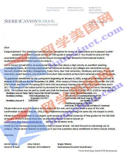 恭喜留美网Sharon同学被美国顶尖私立高中塞拉峡谷高中(Sierra Canyon School)录取