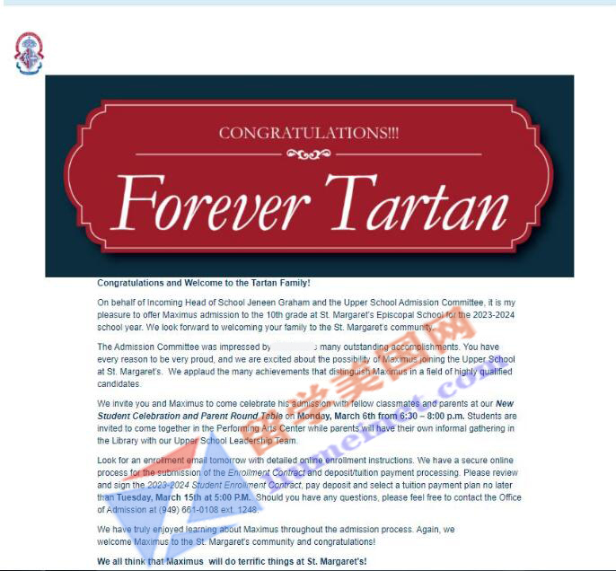 录取喜报,恭喜S同学斩获圣玛格丽特主教学校St.Margaret's Episcopal School录取~