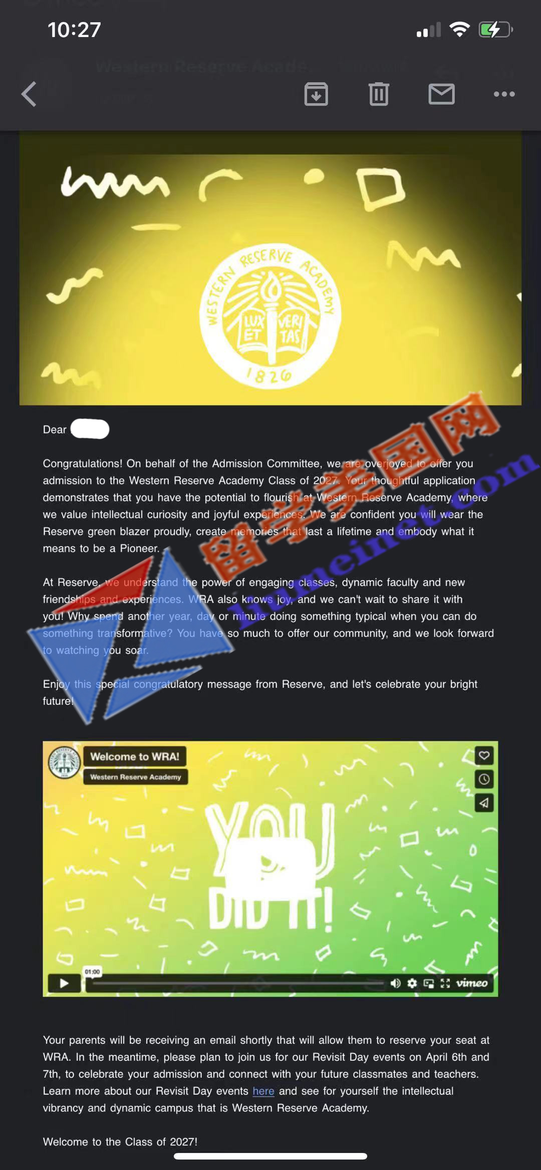 录取喜报,恭喜留美网A同学斩获西储中学Western Reserve Academy录取~