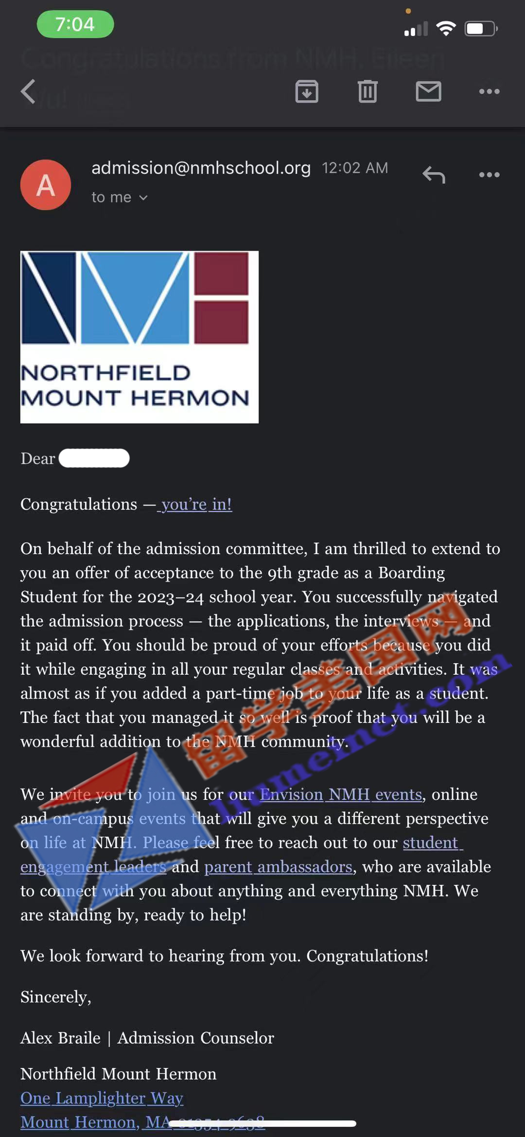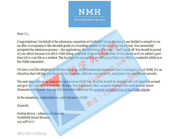 录取喜报,恭喜留美网L同学斩获北野山高中Northfield Mount Hermon School录取~