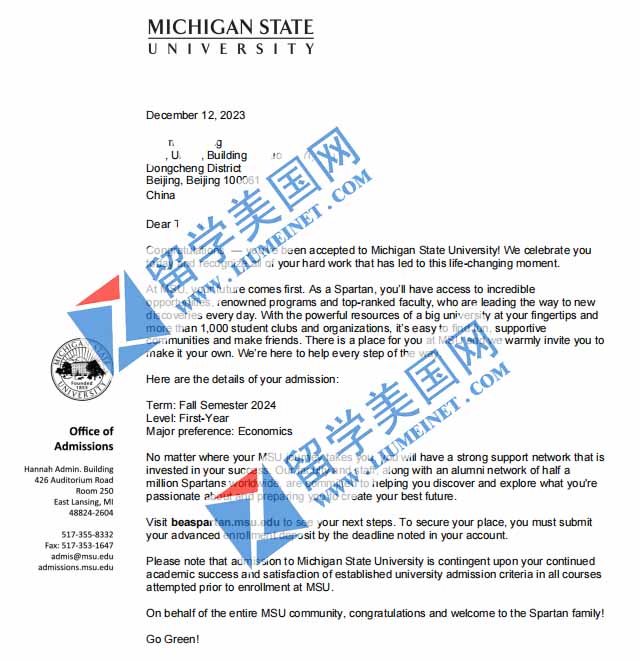 【录取喜报】恭喜留美网T同学斩获密歇根州立大学录取offer