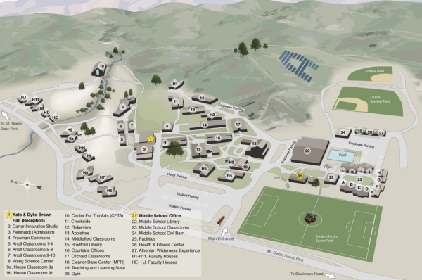 【地理位置】学校位于加州丹维尔的迪亚布洛山山脚下,距离旧金山仅32英里,学生可以乘坐旧金山历史街区的缆车,与硅谷的创新者会面,探索伯克利的美食场景,并欣赏迪亚布洛山山顶的景色;