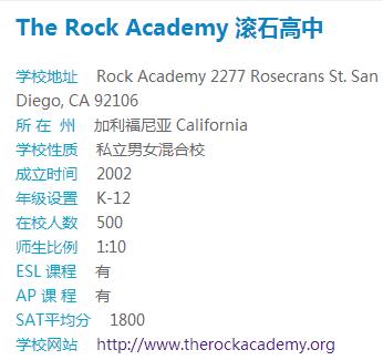 滚石高中The Rock Academy是圣地亚哥地区最新的和发展最快的学校之一,虽然学校非常年轻,但是热情专业的教师和工作人员以及信誉良好的学术和课外活动,使得其学生人数由2002年的38人增长至2011年的435学生。这是一所设施齐备,地理位置便利,性价比高的优质高中。