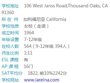 拉瑞娜女中La Reina High School坐落在加州文图拉县的千橡市,人口12万5千,距离加州洛杉矶市中心45分钟车程。这是加州地区非常适合读书的地区。