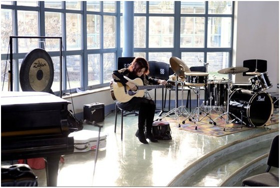 下图是Rosanne Cash在学生们来上她的高级作曲课前调试吉他。