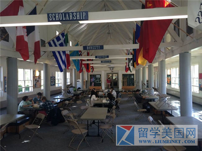 餐厅,中国国旗在右一。横梁上有学校的理念。