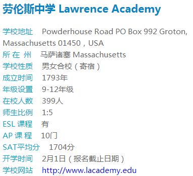 劳伦斯中学 Lawrence Academy 学校简介:学校创建于1793年,位于马萨诸塞州,占地100英亩。中学现拥有399名学生,其中有13%的非白人学生和13%的外国学生,招收9年级至12年级的学生,主要课程包括:英语、外语、数学、科学、历史、艺术、音乐等。劳伦斯中学提供一个以学术研究为重心的教学课程,通过研讨会,项目设计以及独立学习,将传统教学与学生自学很好的结合起来。跳舞,戏剧,音乐,视觉艺术;体育竞技项目;温暖的团体环境;国际多样性;与指导老师的日常见面;宿舍电邮和互联网;广播站;录音室。这些都使得学生生活更加丰富。