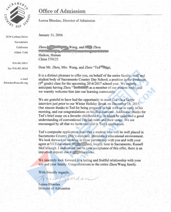 美国加州首府的萨克拉门托贵族学校(Sacramento Country Day School),位于加州首府的一所非宗教顶尖高中,里根总统儿子曾就读该校。2015年,留学美国网的学生是该校年度的第一个录取者,招生官曾到访办公室为学生提供专门面试。