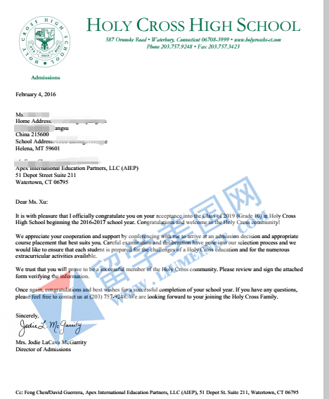 恭喜HZX同学一周即获康州优质中学Holy cross School 录取!