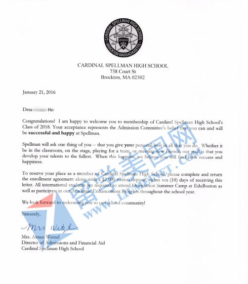 恭喜HZX同学获波士顿卡蒂诺中学录取!