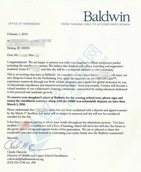 留美网的学生PYC的同学被美国顶级中学鲍德温学校录取!!祝贺她!!第一时间分享OFFER!