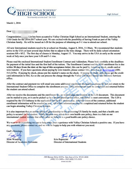 恭喜林同学获硅谷地区最好高中之一的山谷基督中学录取!