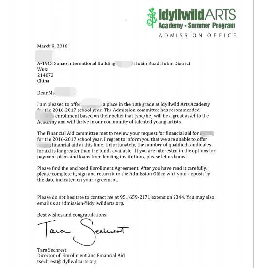 好消息,留学美国网又一同学获得了理想学校的offer。今天,留学美国网XKQ同学等到了期盼已久的 Idyllwild Arts Academy 艾迪怀德艺术高中的offer,便第一时间和留美网分享她的喜悦,感谢留美网老师为她所做的一切。