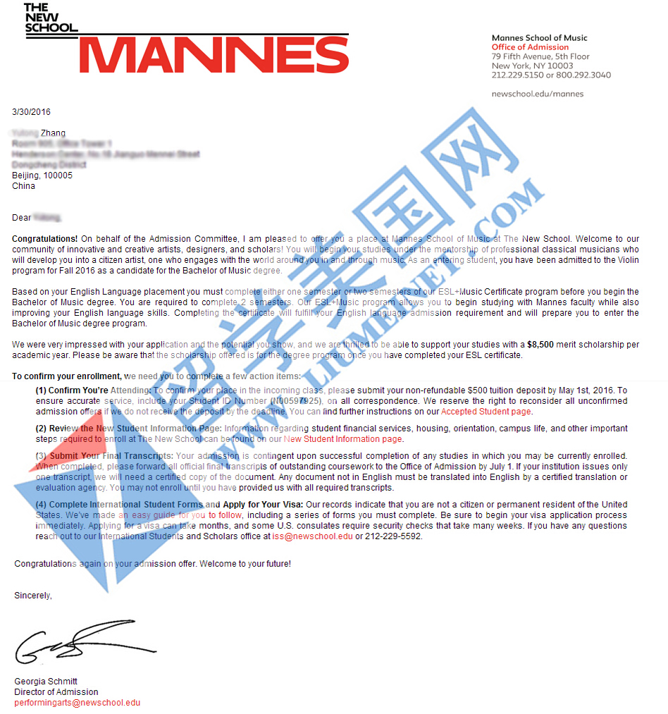 恭喜留美ZYT同学被美国Mannes College of Music录取并获奖学金